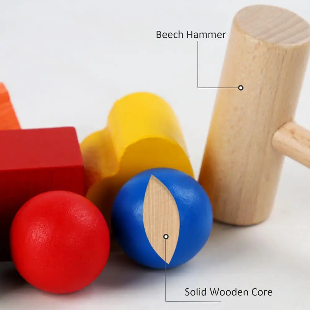 5. Посылка включает в себя 3 красочных шарика, 1 деревянный молоток, 5 геометрических блоков и 1 зубчатый стук.