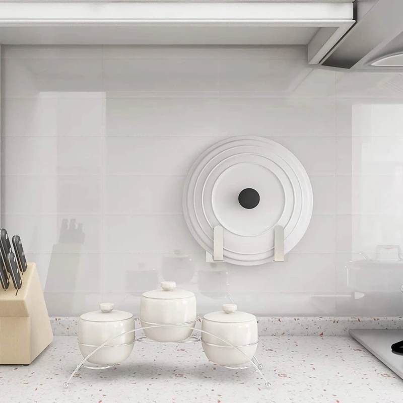 Экономия пространства: держатель крышки горшка может быть установлен на дверце шкафа или стене, чтобы сэкономить место. U-образный дизайн делает размещение товаров более стабильным.