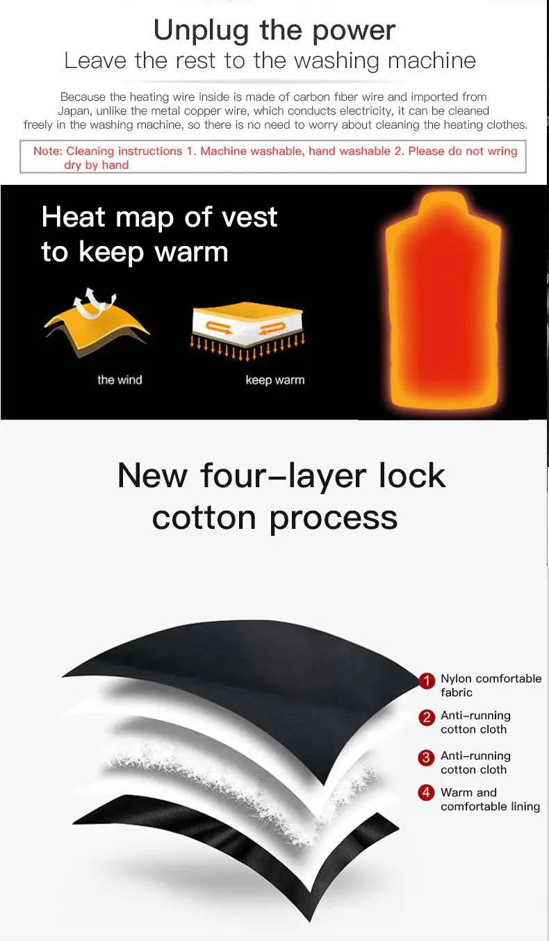 Очистите жилеты с подогревом:Машинная стирка и ручная стирка доступны. Не отжимайте и не крутите.