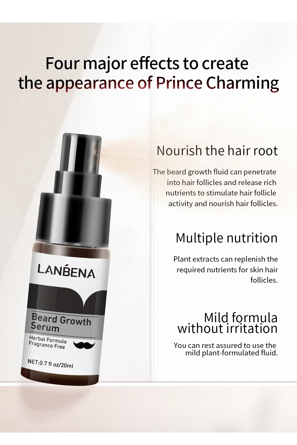 Жидкость для роста бороды может проникать в волосяные фолликулы и высвобождать богатые питательные вещества, чтобы стимулировать активность волосяных фолликул и питать волосяные фолликулы.