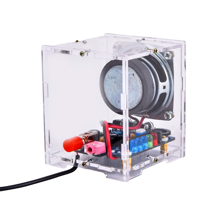 1. Модель: HU-009 2. Схема усилителя мощности: HT6872 аудио усилитель 3. Динамик: 2 дюйма 3 Вт * 1 4. Аудио вход: Bluetooth или аудио кабель 5. Переключатель терминала: выключатель питания, Bluetooth вкл. Или ВЫКЛ., вверх и вниз функция музыки 6. Вспомогательная функция: функция спектра (светодиодный мигание) 7. Режим питания: 5 В DC источник питания 8. Вес: 206 г (с акриловой оболочкой) 9. Размер: 7 см * 7 см * 8,3 см (после сборки) 10. Чехол: акриловый чехол (нужно порвать пленку на акриловой поверхности) 11. Нужно припаять и собрать самостоятельно, содержать учебник