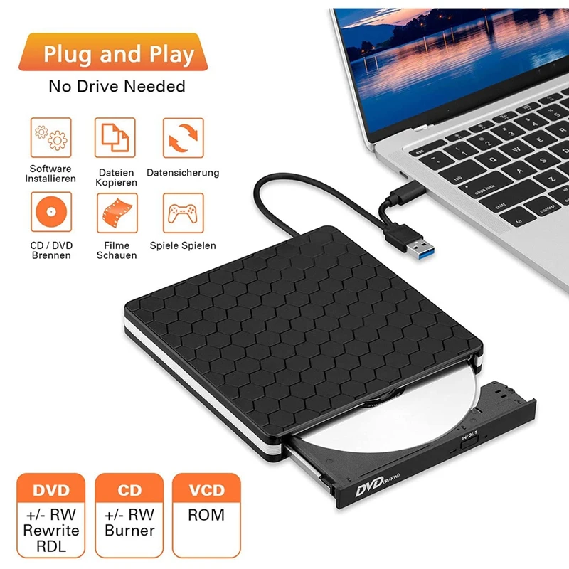 [Plug and Play] -это происходит через usb-соединение, слот заряжается; Не требуется программа драйвера DVD или дополнительный источник питания. Вы можете легко использовать наш драйвер CD / DVD для просмотра фильмов, записи файлов, установки программного обеспечения или создания Резервного диска, который покрывает все ваши потребности в сжигании и воспроизведении.