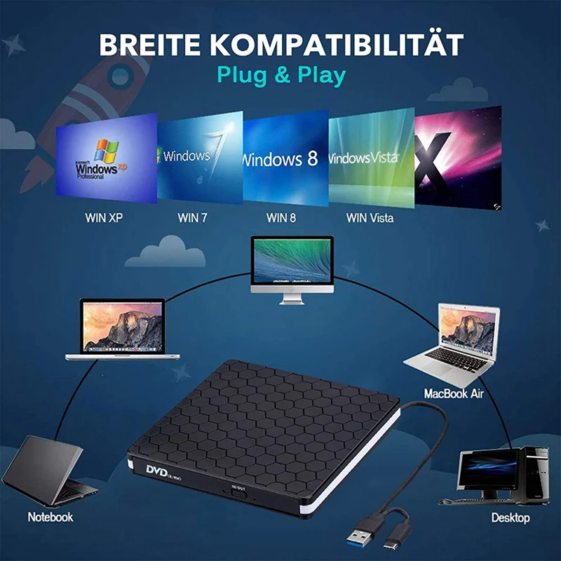 [Внешний DVD привод USB 3,0]-работает с высокоскоростным интерфейсом USB 3,0, обеспечивает более быструю скорость передачи данных (максимум до 5 Гбит/с) и стабильную работу с сильным отказом. Обратная совместимость с USB2.0 и USB1.0.[Широкая совместимость] - CD-ROM / DVD-RM Reader and Recorder добавляет адаптер Type-C, который может поддерживать различные устройства. Совместимость с Windows 2000/2003 / XP / 7/8/10, Vista и всеми версиями систем Mac OS, Apple Air и Pro. Кроме того, этот привод горелки и горелки может считывать и записывать в различных форматах, например, B. CD-R, CD-RW, CD-ROM, DVD-R, DVD-RW, DVD-RAM, DVD-RW.