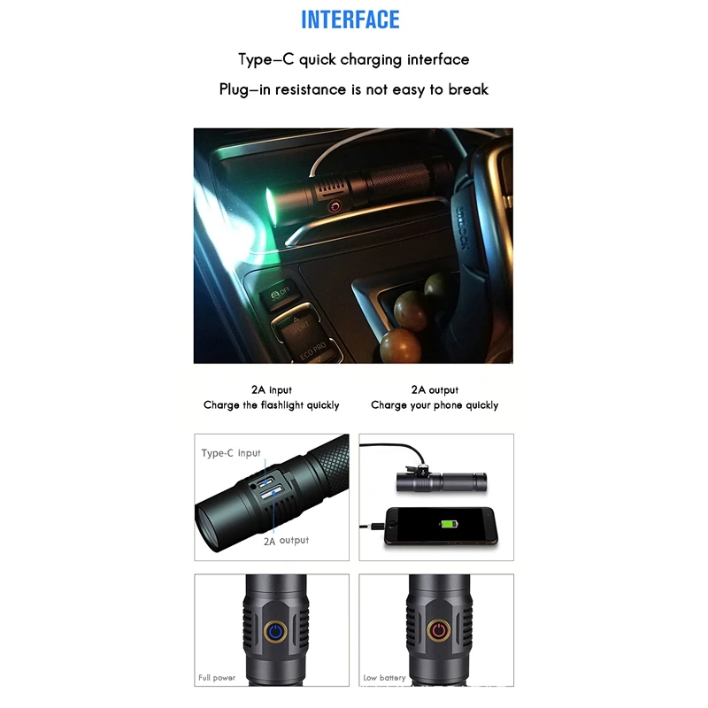 Когда батарея низкая, вы должны зарядить фонарик вовремя. Красный индикатор светильник будет на время зарядки, в то же время, полностью заряжен, он светильник загорится зеленым цветом для предотвращения перезарядки.
