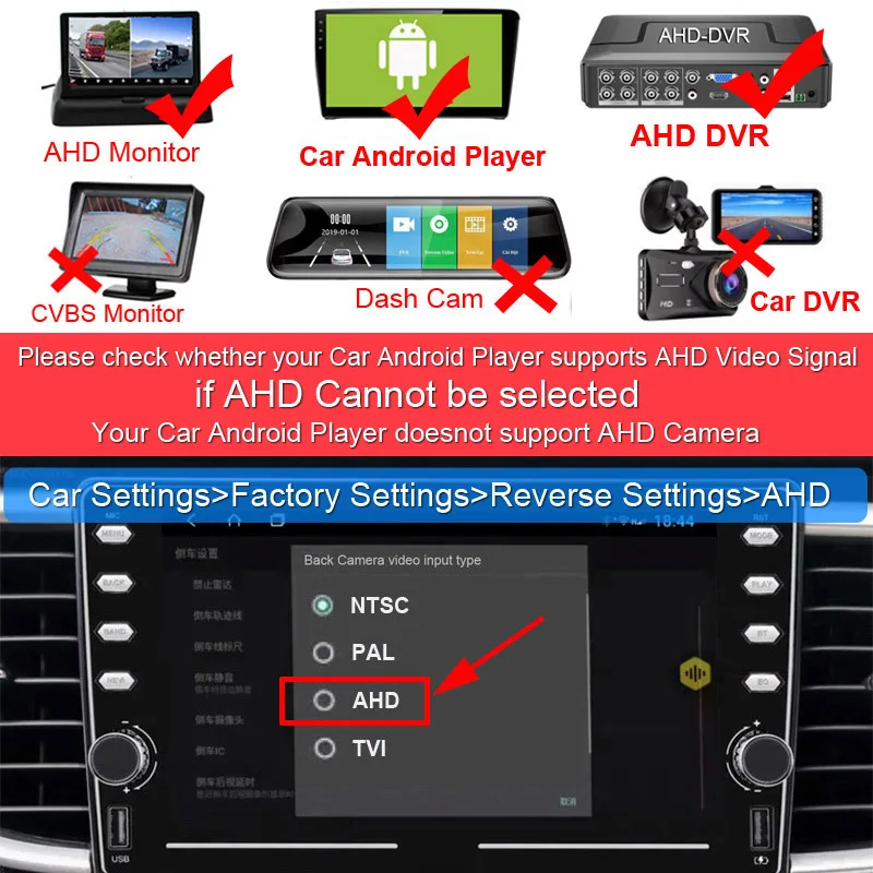 Пожалуйста, проверьте, поддерживает ли ваш автомобильный Android плеер AHD камеру! Если AHD не может быть выбран, AHD камеры не поддерживаются!