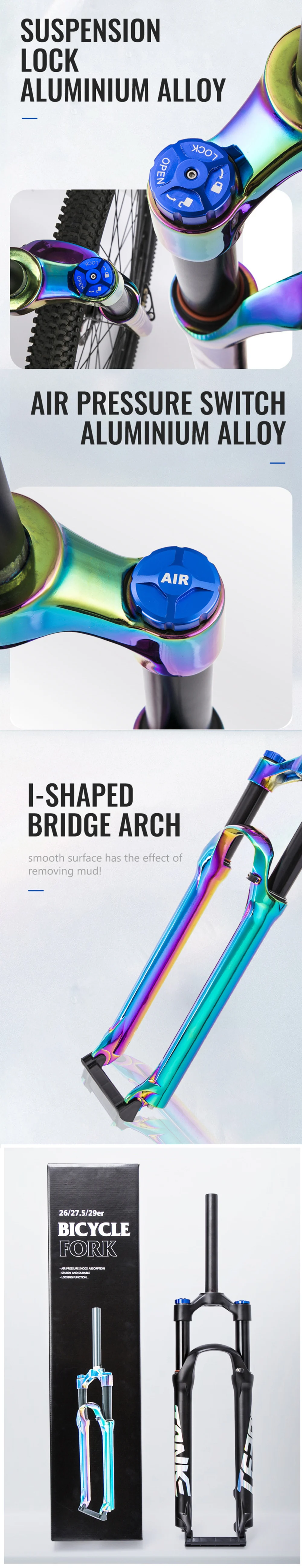 Функция воздушный клапан давления: мягкая и жесткая прочность амортизатора может быть достигнуто путем регулировки давления воздуха. Чем ниже давление воздуха, тем мягче передняя вилка, которая подходит для ухабистых дорог; Тем выше давление воздуха, тем жестче передняя вилка. Подходит для езды по ровным дорогам