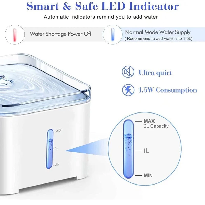 【Уникальный дизайн: окно уровня воды с светодиодный светильник напоминает вам о добавлении воды во время дня или ночью. И это легко для домашних животных пить воду через наклоняющийся верхний лоток.