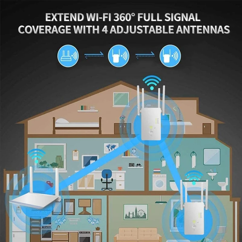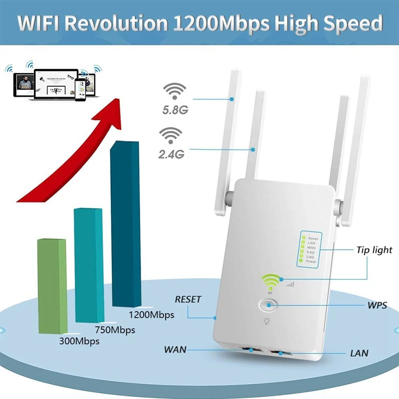 2. ac1200 скорости Wi-Fi и двухдиапазонный Wi-подключение: при температуре не выше 5,8 ГГц (867 Мбит/с) и 2,4 ГГц (300 Мбит/с), что является самым высоким показателем скорости Wi-Fi 1200 Мбит/с может свести к минимуму потерю передача данных. Благодаря двухдиапазонной технологии усилитель WiFi может автоматически выбирать высококачественные Частотные полосы для достижения лучшей производительности.