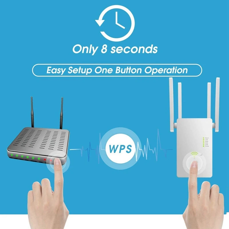 3. Кнопка настройки: просто нажмите кнопку wps на Wi-Fi роутере и повторителе, вы можете подключиться в течение 8 секунд или настроить 2 минуты через веб-сайт браузера на вашем смартфоне/планшете или ноутбуке.