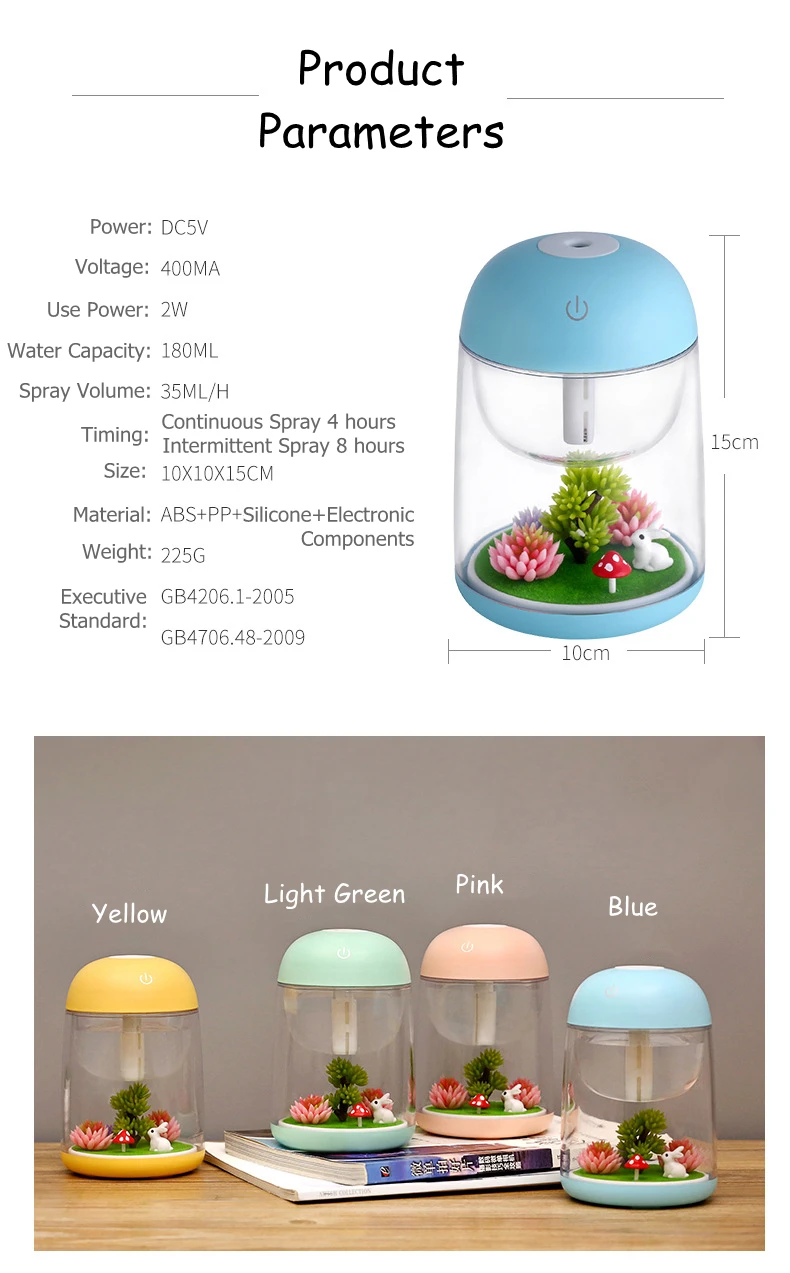 Продукт: мини-увлажнительМатериал: АБС + ППРезервуар для воды: 180 млРазмер: 100*100*150 (мм)Цвет: синий, розовый, зеленый, желтыйМощность: 2 ВтНапряжение: 5 В постоянного токаХарактеристика:1. Красочный светильник2. Портативный USB способ зарядкиСпособы подключения:1. Зарядное устройство для телефона2. Внешний аккумулятор3. Usb-порт для ноутбукаПосылка включает:1. Увлажнитель * 12.USB кабель * 13. Руководство * 1