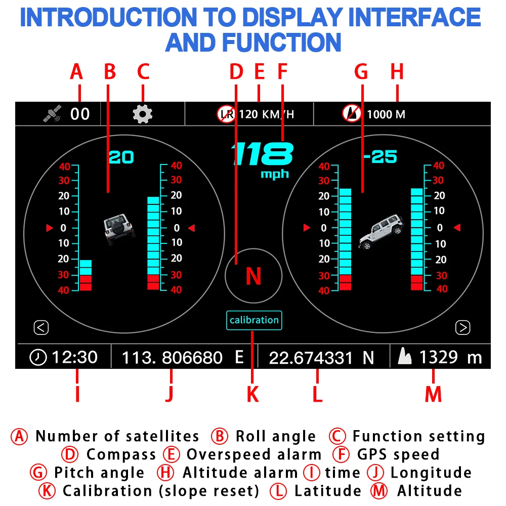 ● Угол наклона и угол поворота автомобиля: -40 ° ~ + 40 °