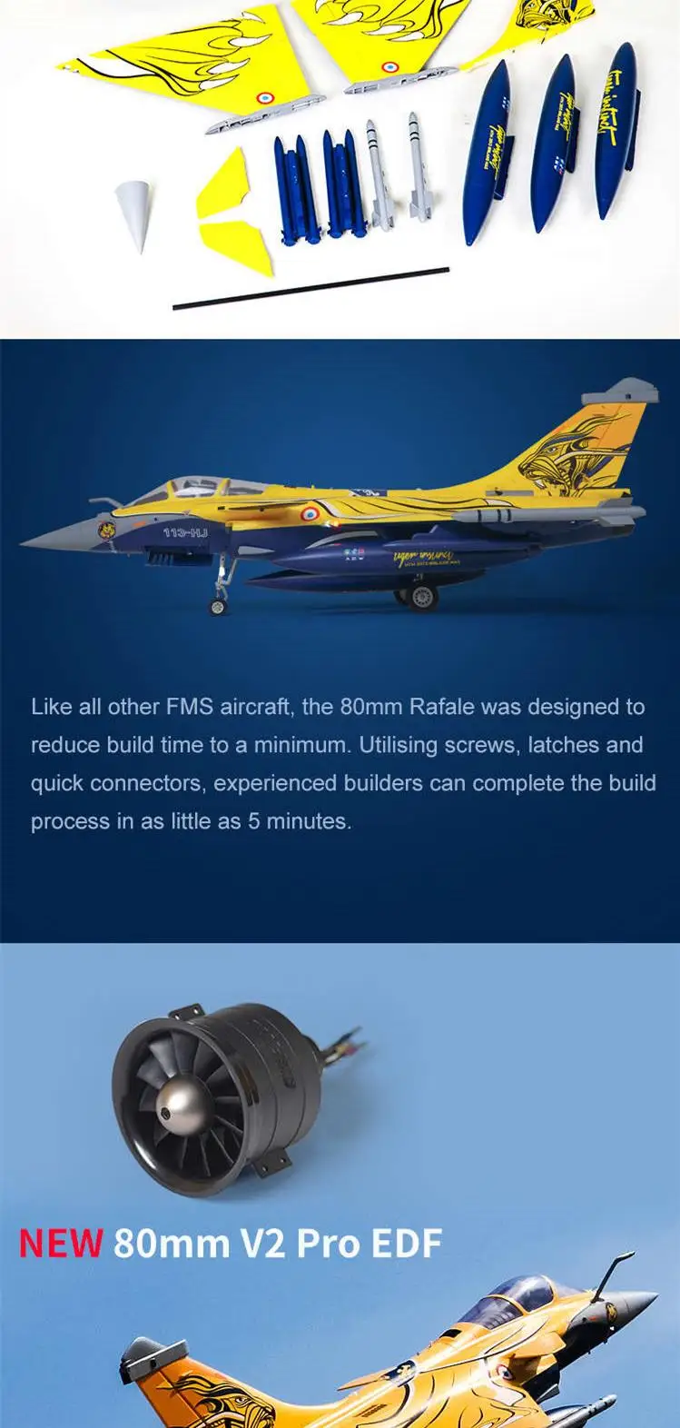 Как и все другие FMS летательные аппараты, 80 мм Rafale был разработан, чтобы уменьшить время сборки до минимального. Используя винты, защелки и быстрые разъемы, опытные строители могут завершить процесс сборки всего за 5 минут.
