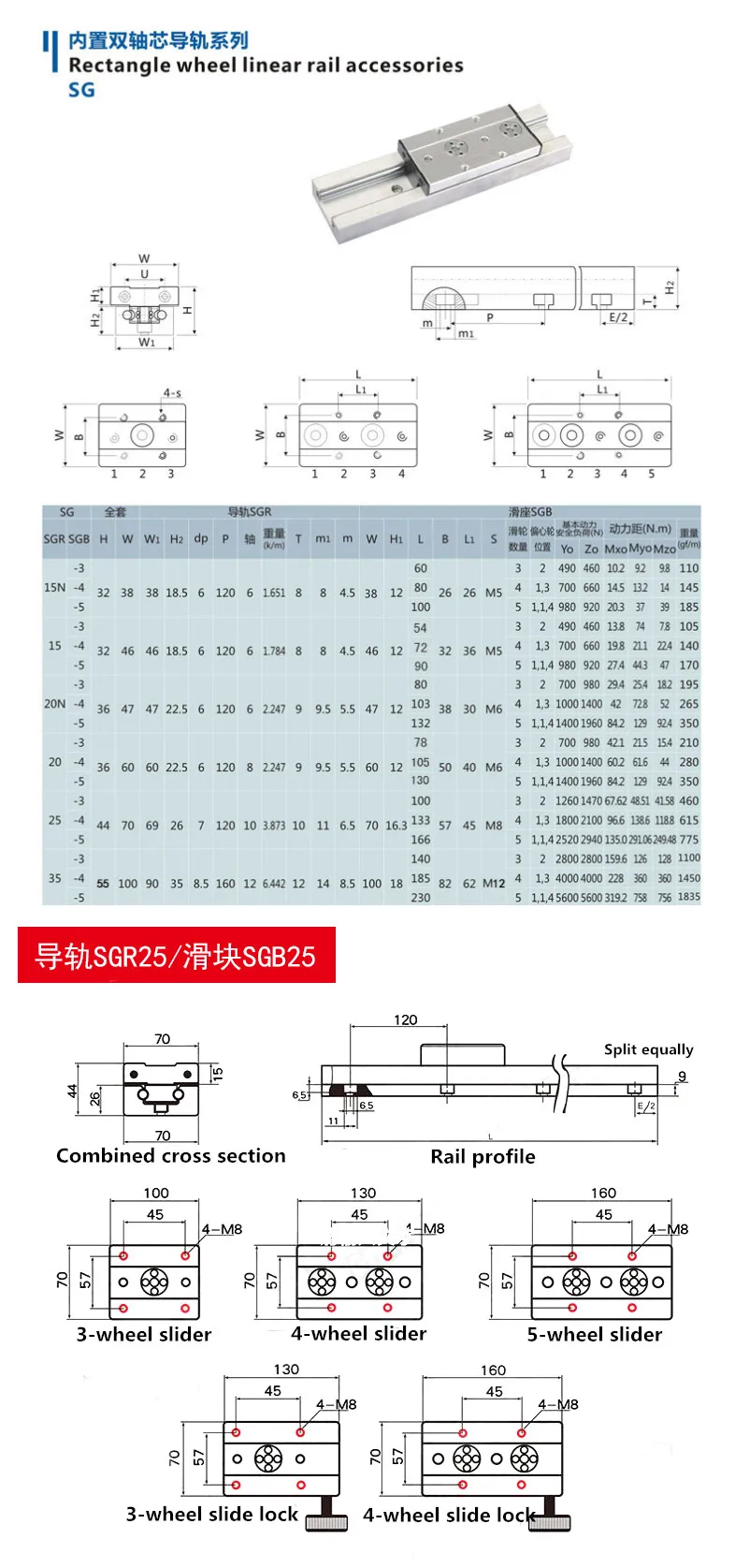 Особенности:Встроенные двухосные линейные направляющие размещают Оптически ось внутрь, И Используйте эксцентриковое колесо ДляКонтроль Точность соответствия.Представьте:Высокоскоростная направляющая. В котором скользящий блок и ролик Сформированный в одном куске.Применение:Раздвижные пазы раздвижных дверей, Железнодорожные пути, Направляющие лифта, Шторы.Модель:SGR25 рейка + SGB25-3/4/5 колесо с блокировкойДлина рельса:150-1150 мм