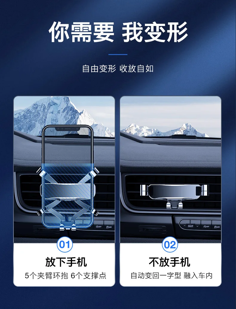 Дизайн: инновационный дизайн, гравитационная связь и треугольная поддержка, автоматически зажимается, когда телефон надевается на держатель, устойчивый и стабильный, отпустите автоматически, когда снимите телефон с держателя, легко и удобно. Прочная и хорошо Защитная: Высококачественная резка из алюминиевого сплава, поверхностное окисление, Для крепления на автомобиле используется эластичный и противоскользящий зажим, плотно удерживающий вентиляционное отверстие, мягкие резинки на вентиляционном отверстии, чтобы не царапать устройства.