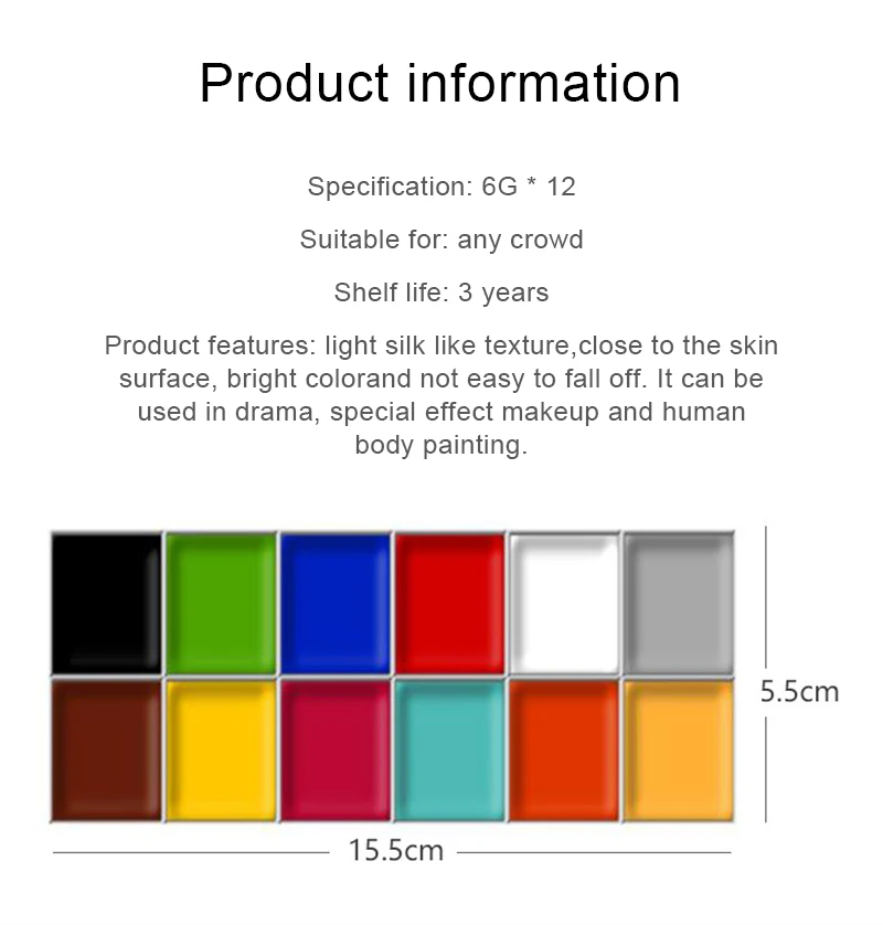 Характеристики продукта: различные цвета, светильник с шелковой текстурой, легко сидит на поверхности, яркий и яркий цвет, не легко отвалится. Используется для драмы, праздников, макияжа спецэффектов.