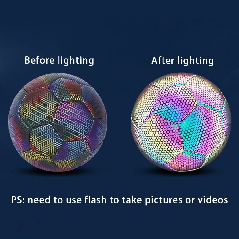 Светоотражающий эффект: отличается от обычных футбольных мячей, этот светоотражающий футбольный мяч использует инновационную отражающую технологию, которая делает футбольный мяч светиться, когда ваш мобильный телефон включит вспышку, чтобы делать видео или фотографии.