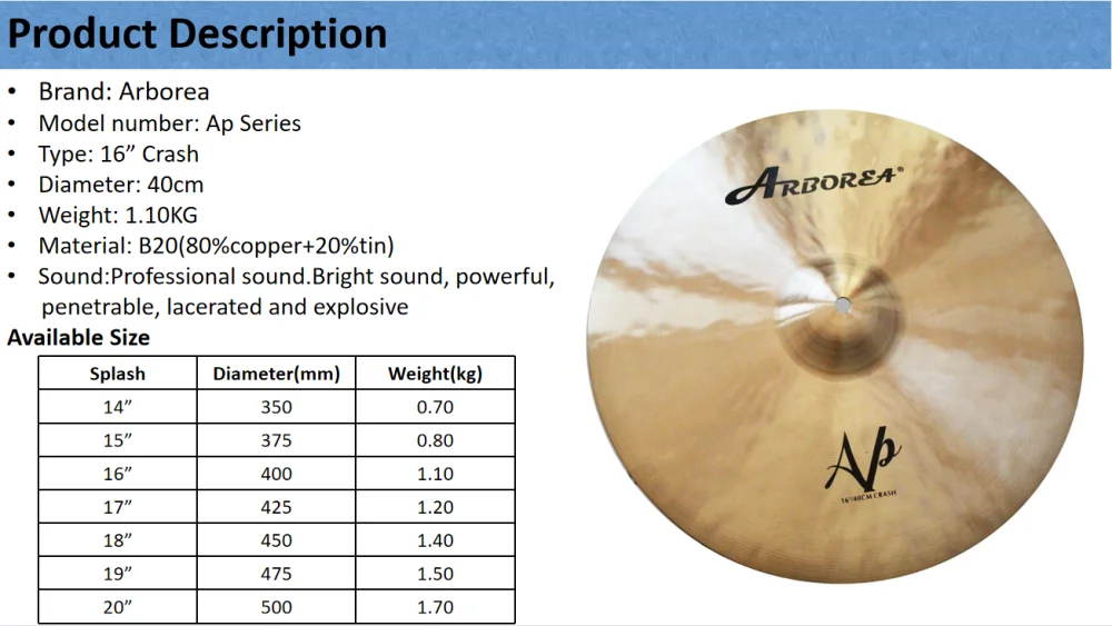 Самые профессиональные «ARBOREA» cymbal, gong и другие медные ударные инструменты были проданы по всему мируСлово в последние годы, удерживая безопасный свинец в слове медных ударных инструментов. Наша компания постоянноРазработанные продукты адаптированы к стилю различного музыкального качества так же, как и его бренд, его сильная выразительная сила не может быть ограничена, что приведет вас в настоящий рай музыки.