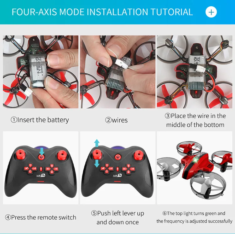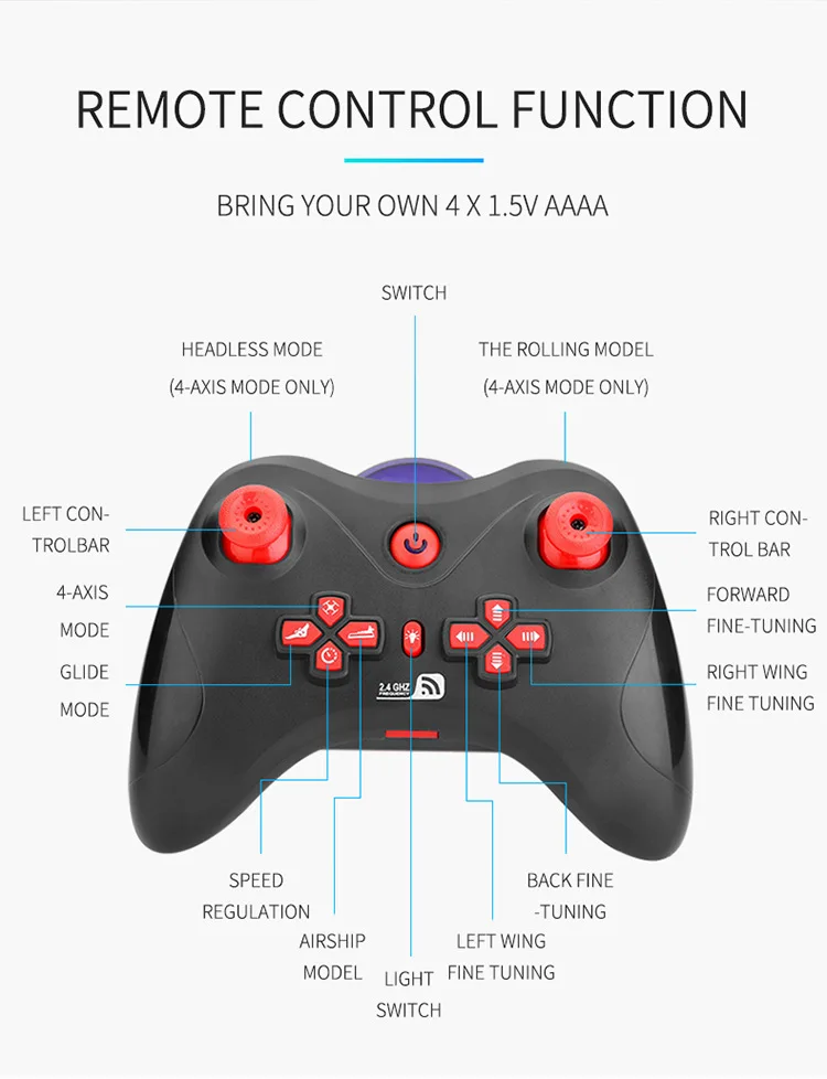 Описание функции: режим «все в одном»: четырехосевой светильник f, режим скольжения, режим работы на воздушной подушке; 3D рулон, Безголовый режим, переключатель на светильник, регулировка скорости на три скорости; вперед и назад, левая и правая сторона fly; 2,4G Беспроводное управление