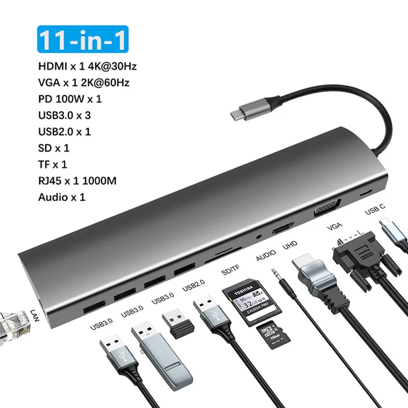 USB C концентратор 11 в 1 док-станция с двойным 4K HDMI 3 USB 3.0 портов 100 Вт PD зарядка RJ45 адаптер Ethernet сплиттер