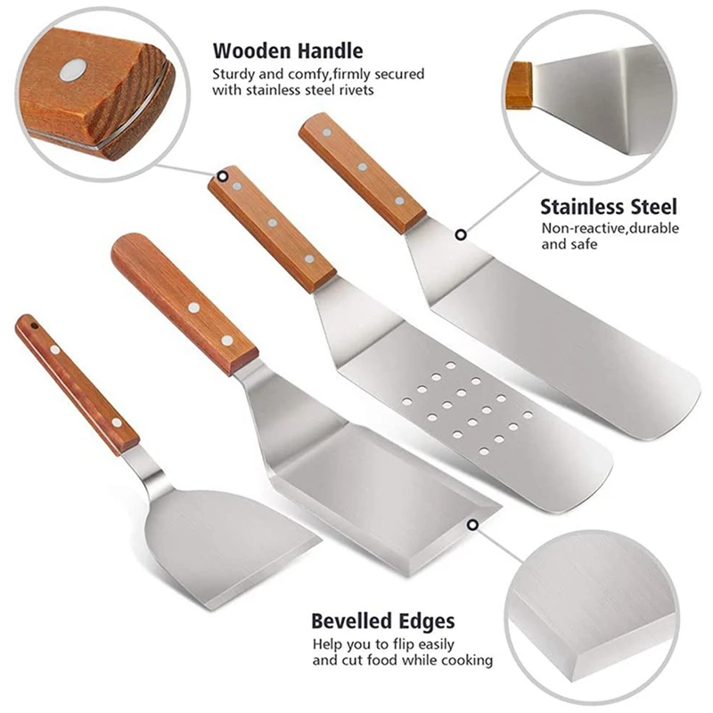 [Высококачественный материал] изготовлен из высококачественной твердой древесины и профессиональной нержавеющей стали, ручка из твердой древесины обладает сильной термостойкостью и может эффективно предотвращать ожоги рук. Этот набор аксессуаров для сковороды с плоской подошвой для гриля изготовлен из нержавеющей стали, которая является чрезвычайно прочной. Не ржавеет и прочен; Толстое лезвие предотвращает деформацию.