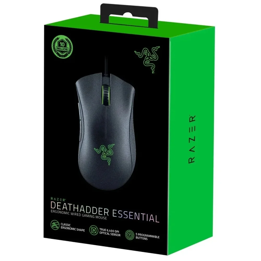 Razer DeathAdder Essential 2021 RZ01-03850100-R3M1 представляет собой обновленную версию игровой мыши с проводным подключением, которая завоевала репутацию надежности среди геймеров благодаря своей проверенной долговечности и эргономике. Благодаря оснащению модели оптическим сенсором с реальным разрешением 6400 DPI обеспечивается высокая скорость отклика и максимальная точность позиционирования. Мышка имеет подсветку зеленого цвета, а также поддерживает режим постоянной готовности Always-On.