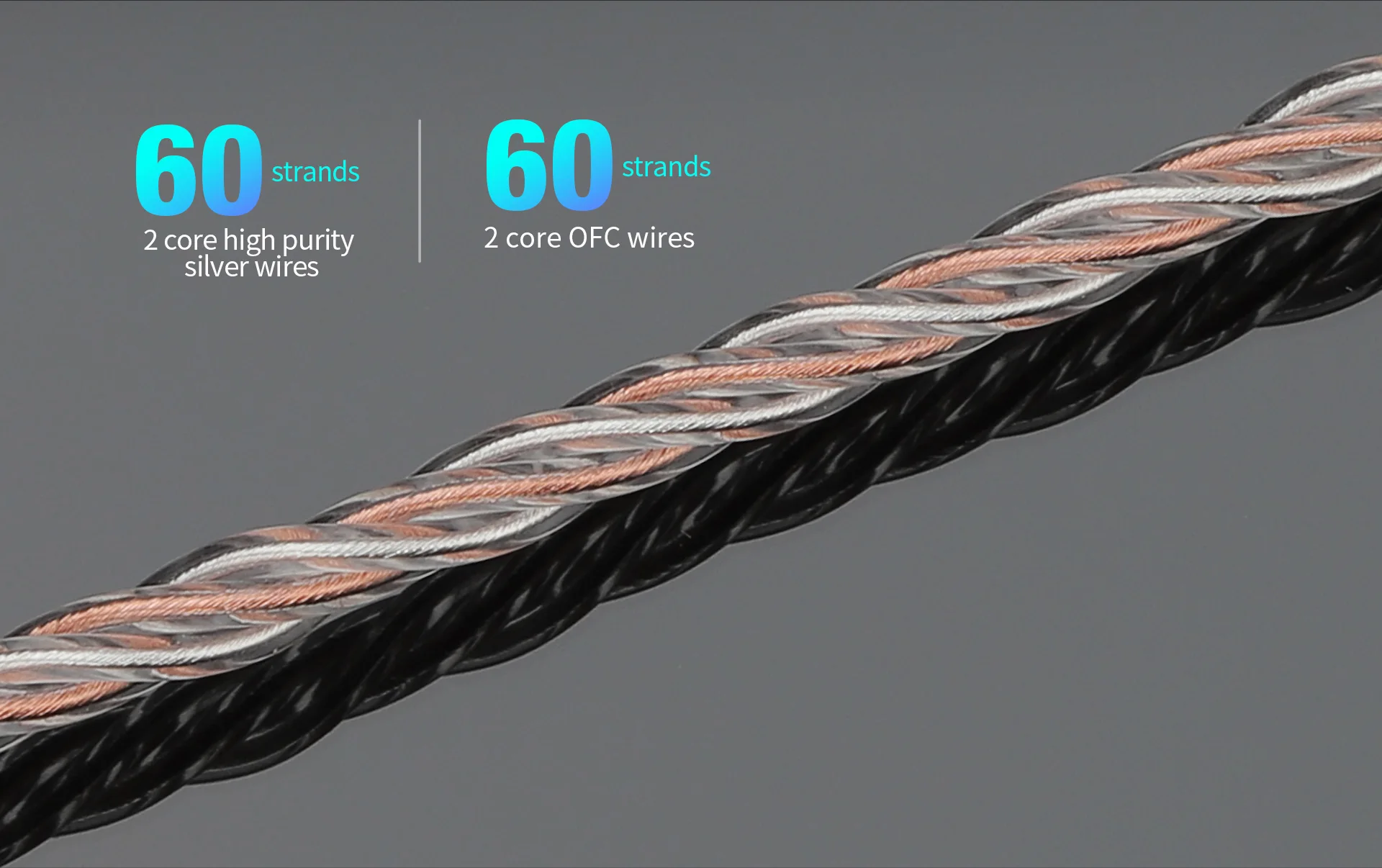 Смешанная оплетка из 2 ядер высокой чистоты серебра + 2 ядра OFC проводов (по 60 нитей). Серебряные провода обеспечивают более яркое и чистое качество звука. Провода OFC добавляют более гладкую и мягкую производительность.