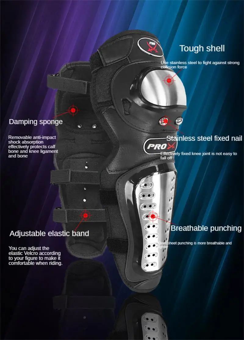 Функция: Защита от падения и столкновений. Его корпус изготовлен из нержавеющей стали, чтобы противостоять сильному воздействию. Он оснащен Демпферная губка для защиты костей и связок. Он оснащен крепежными гвоздями из нержавеющей стали для эффективного фиксации коленного сустава, который нелегко отвалить; Регулируемая эластичная лента, регулировка эластичной липучки в соответствии с вашим телом