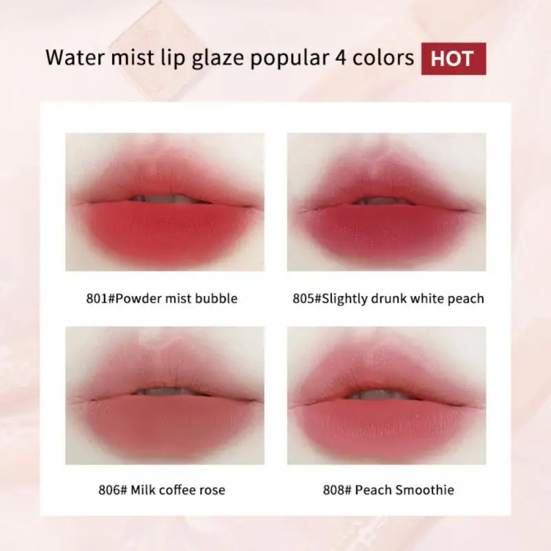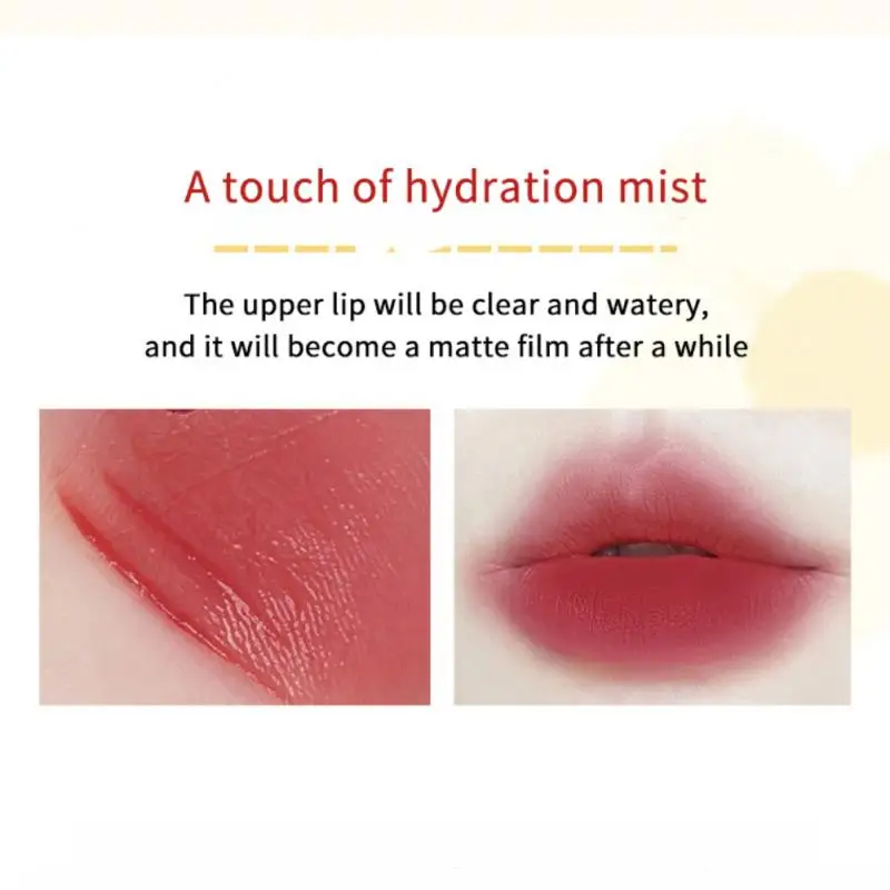 Характеристики продукта: текстура крема-это светильник, туманный и мягкий, а цвет-яркий и яркий. Он мягко скользит по губам, чтобы придать губам туманный Макияж лица. Увлажняет и увлажняет. Матовый эффект макияжа