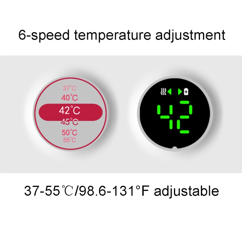 37 °C,40 °C,42 °C,45 °C,50 °C,55 °C,6 передач контроль температуры, 37-55 °C/98,6-131 ° F постоянная температура нагрева: эффективное обслуживание питательного молока, и вы можете пить молоко во время нагревания, Аккумулятор 6000 мАч может держать тепло в течение 2-3 часов, может использоваться во время зарядки. Этот портативный нагреватель воды с постоянной температурой имеет встроенный чип датчика температуры, который может точно контролировать температуру. 37 °C/98,6 ° F (мин) до 55 °C/131 ° F (макс.). Отображение температуры в реальном времени. Попрощайтесь с повторными измерениями температуры.