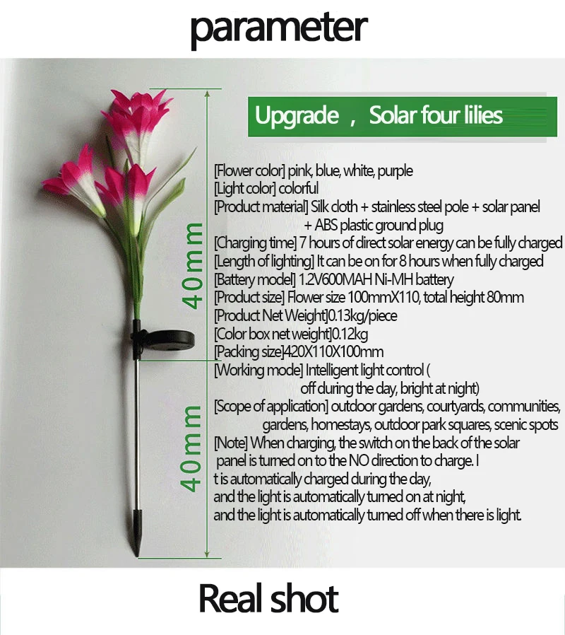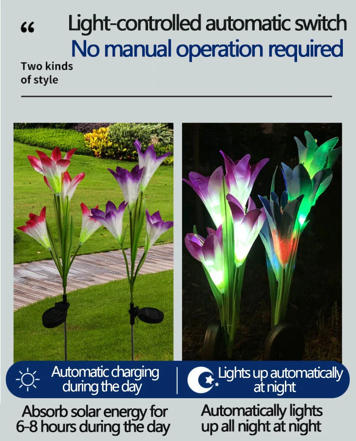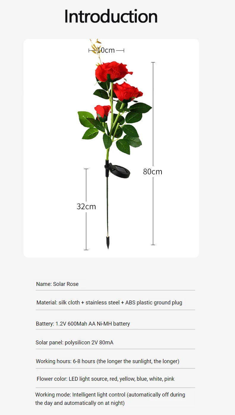 Здравствуйте, дорогой покупатель, после получения этого продукта, пожалуйста, включите переключатель «нет» в течение дня, чтобы цветы могли поглощать достаточно солнечной энергии, чтобы убедиться, что цветы достаточно освещены ночью.