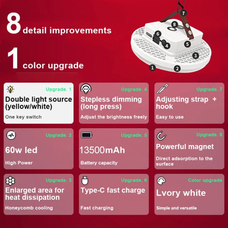 Примечание: 1. Профессиональный Фабричный Интернет-магазин 4. Пожалуйста, не направляйте лампу на глаза, потому что ее супер яркий светильник может сделать ваши глаза чувствовать себя некомфортно. Характеристика:1. Аварийное освещение, ночное освещение, отдых на открытом воздухе, Кемпинг, туризм, охота, альпинизм, рыбалка, чтение и т. д.2. Многоцелевой светодиодный светильник для кемпинга, аварийная ночь, настольная лампа, настенный подвесной светильник, безопасный и энергосберегающий; Портативный с высокой яркостью.3. Для кемпинга, чтения, стола, стены, катания на лодках, рыбалки, ремонта автомобилей и так далее.4. Это очень яркий lanterna, длительный срок службы батареи может поддерживать ваши ежедневные потребности в кемпинге.Характеристики:Товар: палатка lanternaМатериал изделия: АБС-пластикЕмкость аккумулятора: 2000 мАч/4800 мАч/7200 мАчС дисплеем зарядаПримечания:1. Возможны незначительные отклонения в размере из-за ручного измерения, различных методов измерения и инструментов.2. Изображение может не отражать фактический цвет изделия из-за различных фотографирования светильник, угол и дисплей монитора. |