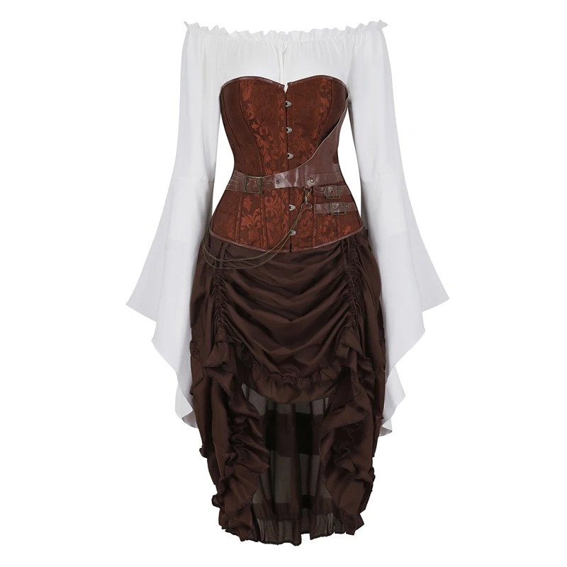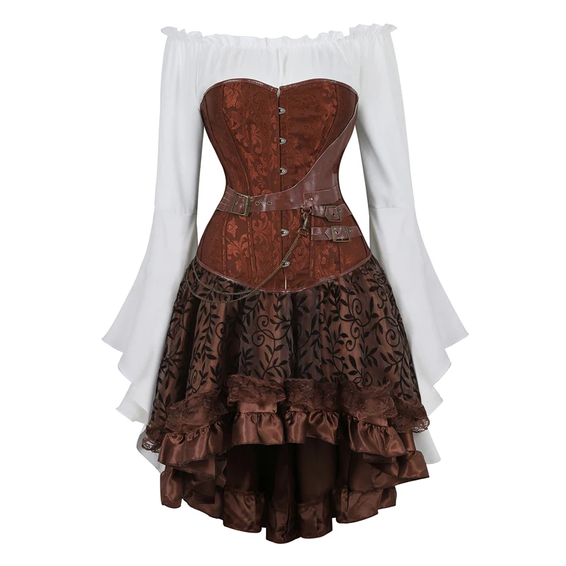 Корсет в стиле стимпанк с юбкой костюм пирата женская готическая одежда Бурлеск коричневый Корсет Топ 3 предмета корсет платье размера плюс
