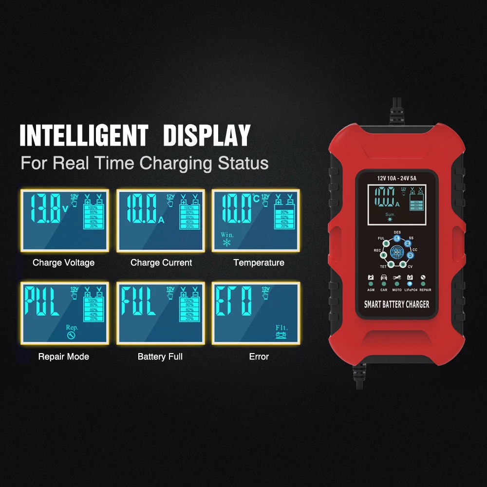 12V-24V 10A полностью автоматический Батарея Зарядное устройство s цифровой ЖК-дисплей Дисплей автомобиля Батарея Зарядное устройство Мощность Puls ремонт Зарядное устройство свинцово-кислотный LiFePo4