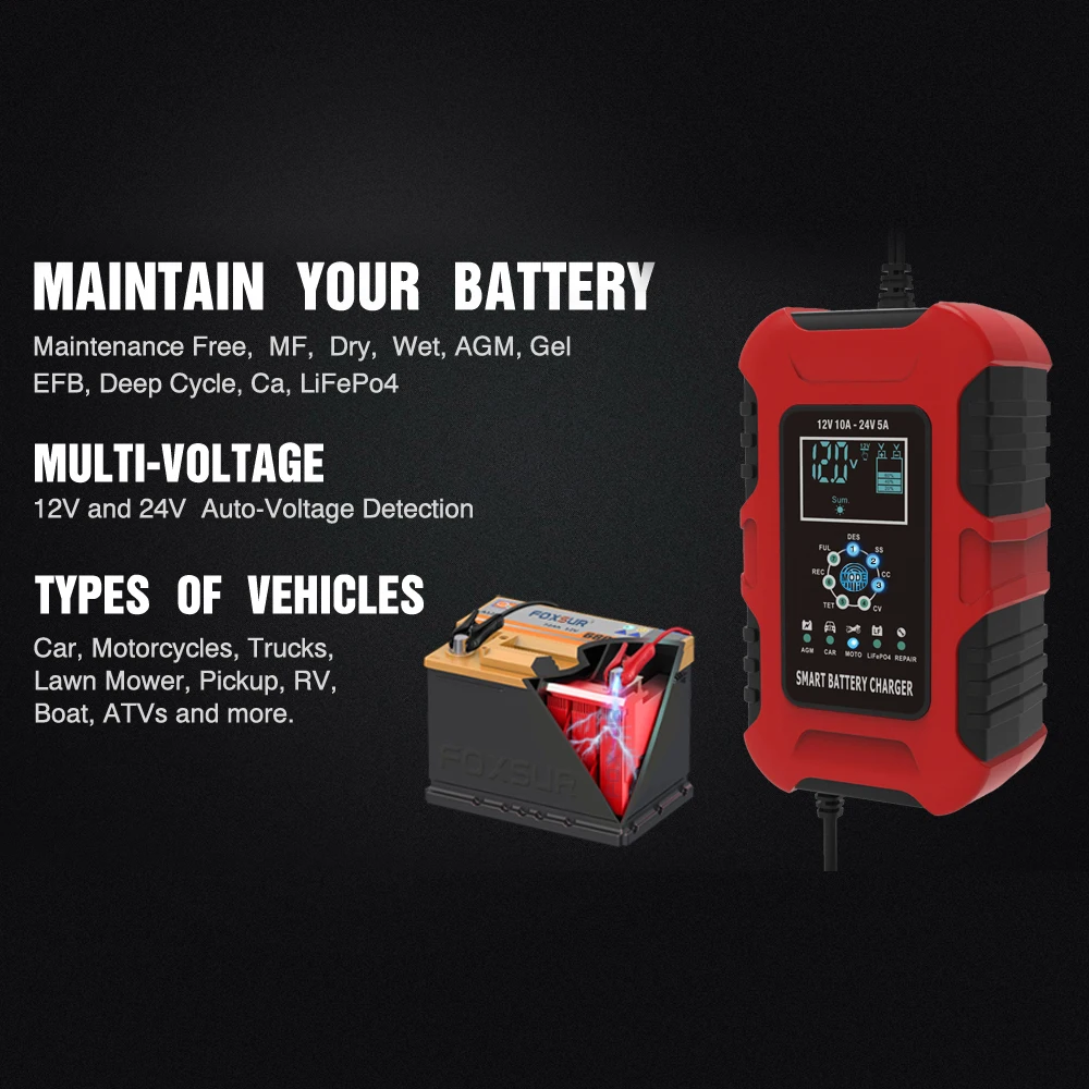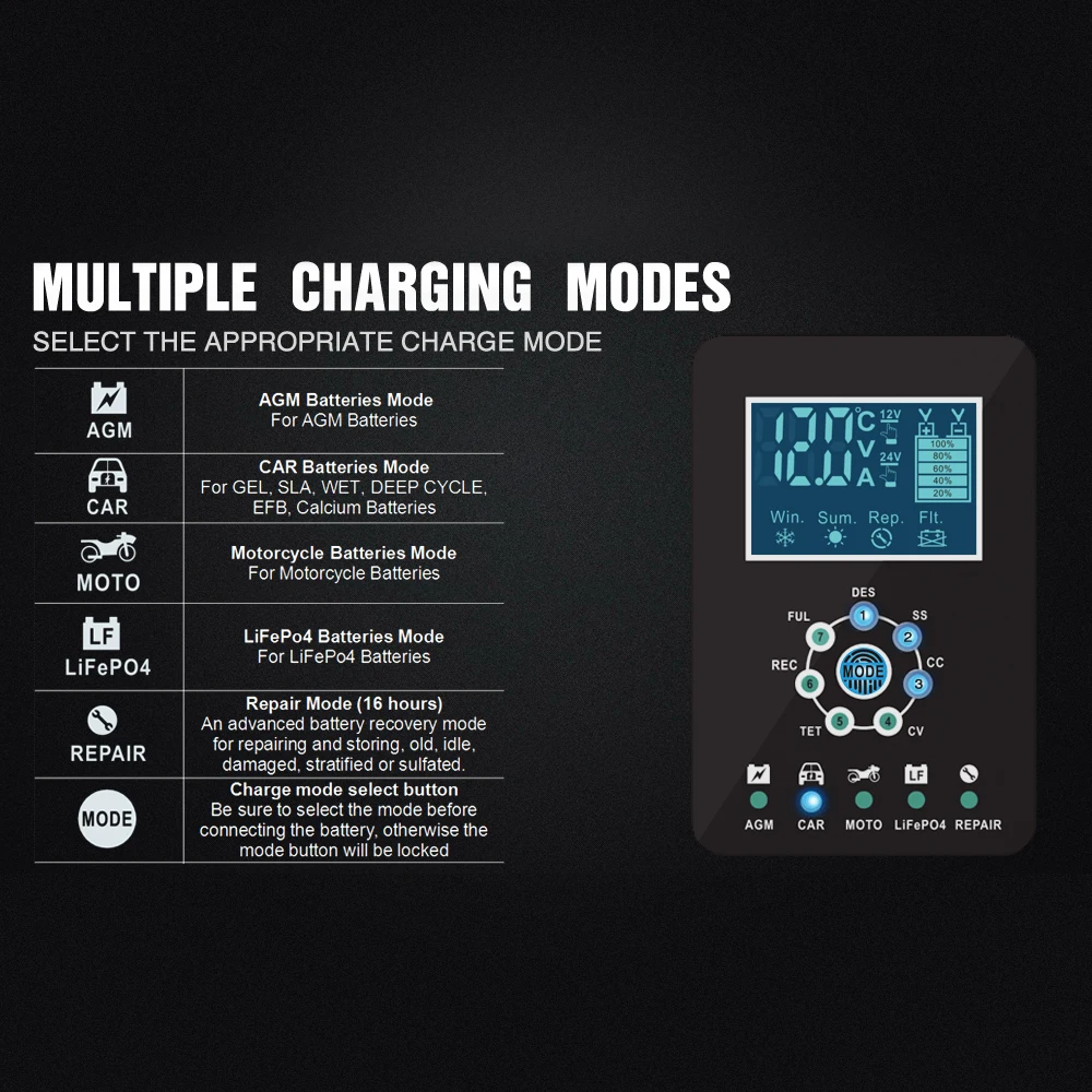 7 уровня зарядное устройство подходит для большинства типов аккумуляторов, включая кальций, гель с клапанным регулированием LiFePo4, свинцово-кислотных аккумуляторных батарей. Они также могут помочь восстановить истощенные и сульфированные батареи.
