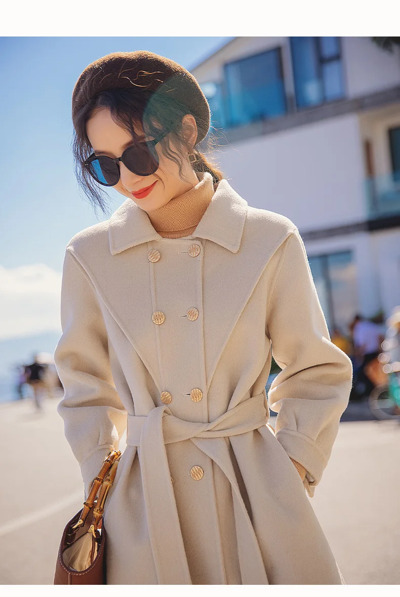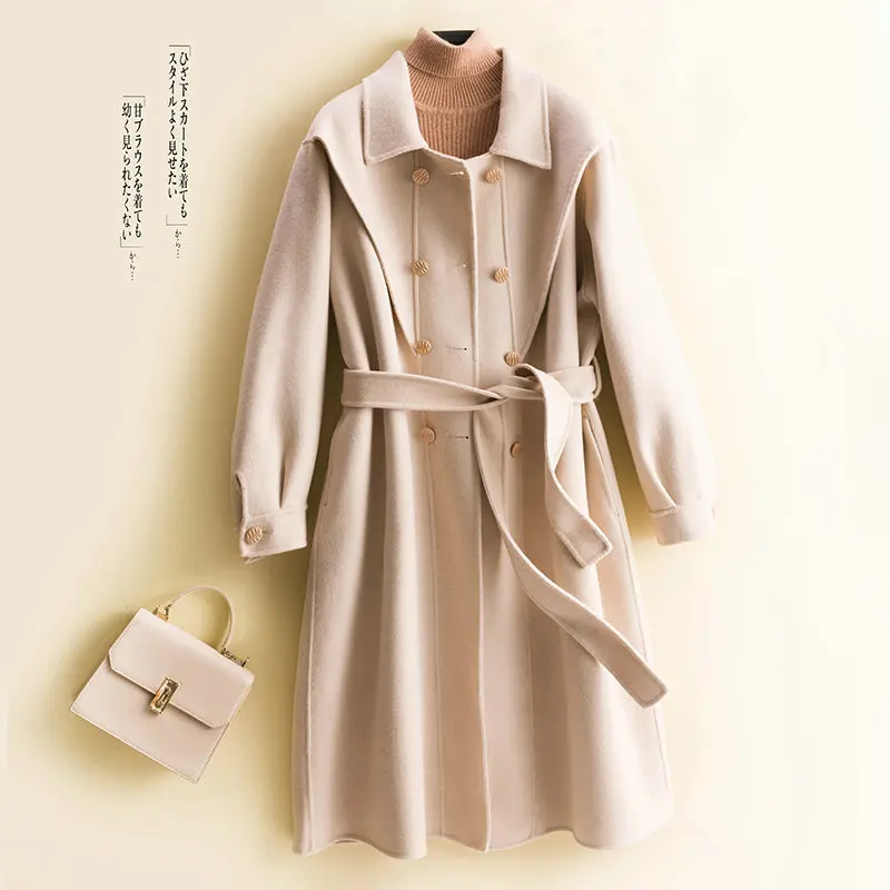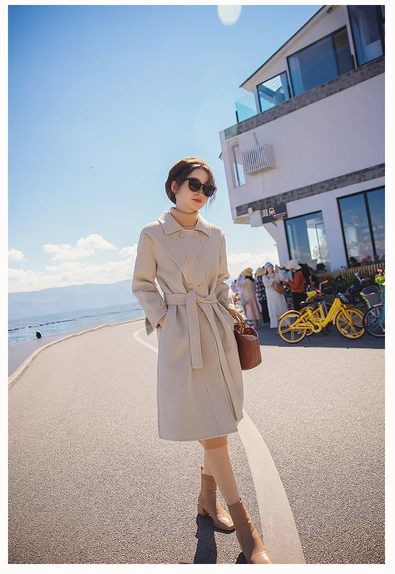 Новинка, высокое качество, женское длинное зимнее пальто из 100% шерсти, модное, мощное, офисное, женское, шерстяное пальто с поясом, тонкий, двубортный, теплый Тренч