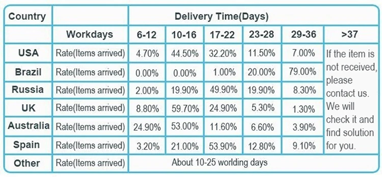 1. Нормальное время доставки показано ниже. Но мы не можем гарантировать время доставки.