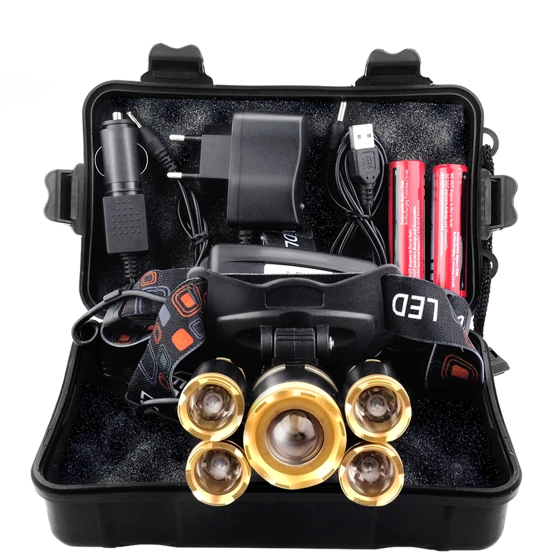 Посылка J: 1 налобный фонарь (5 светодиодный HT30 золотистый) + 1 автомобильное зарядное устройство + 1 зарядное устройство переменного тока + 2 аккумулятора 18650 + 1 зарядное устройство usb + 1 налобный фонарь