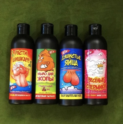 В наборе: - шампунь для яиц "Душистые яйца" - гель для пениса "Расти шишка" - шампунь - "Веселые спермики" - мыло для жопы "Какашка"
