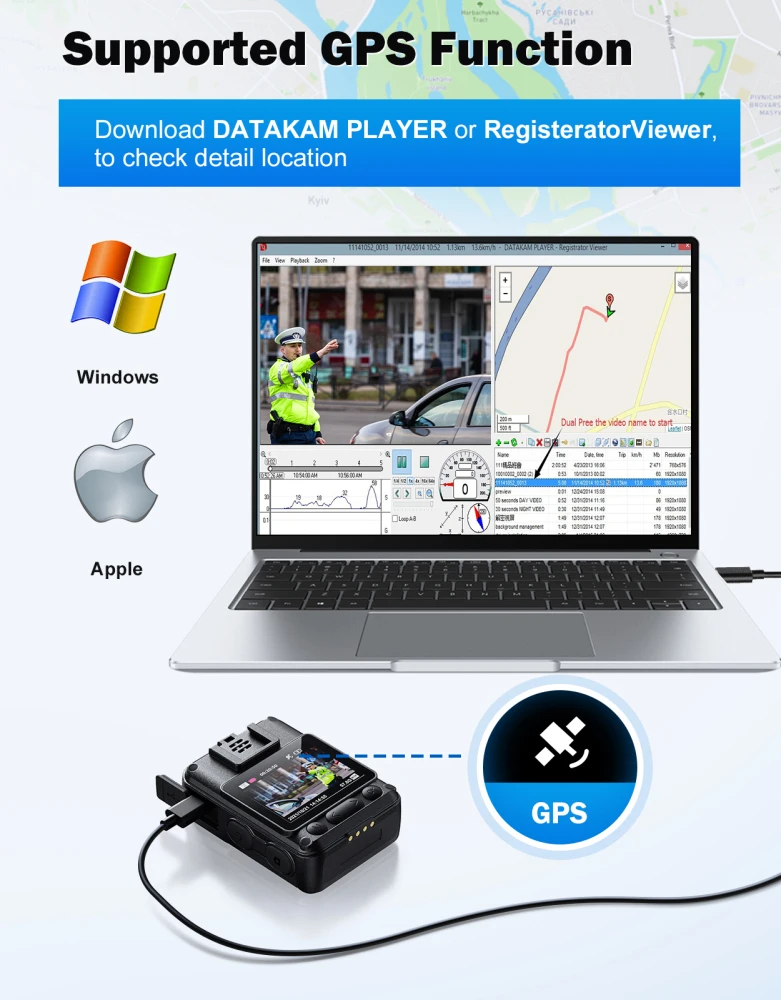 【BOBLOV M6 полицейская камера с функцией GPS 】дополнительная функция GPS может сохранить gps-видео в отдельный файл после включения меню функции в камере. Найдите проигрыватель DATAKAM или регистратор для воспроизведения видео и проверьте детальное местоположение.