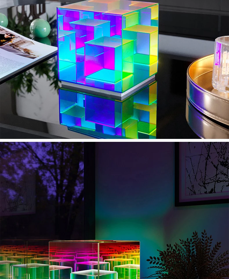 Постсовременный дизайн акриловый USB светодиодный Настольный светильник 3D прикроватная тумбочка для спальни светодиодный ночник волшебный куб цветной атмосферный Настольный светильник