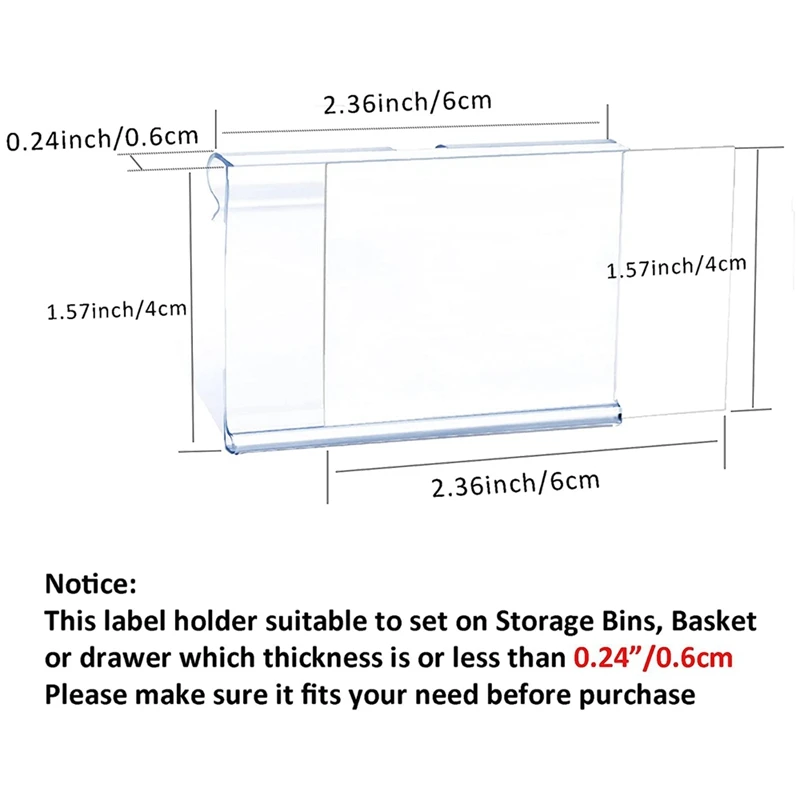 Dimensions: Length x Width: 2.4 x 1.6 inches/6 x 4 cm, suitable for daily use. You can easily buckle them on the shelf without using other tools. These labels are slightly softer, making it easy to insert price tags. These label holders are suitable for storage boxes and baskets or drawers with a thickness or less than 0.24 inches/0.6 cm. Please make sure that the size meets your needs before placing an order.