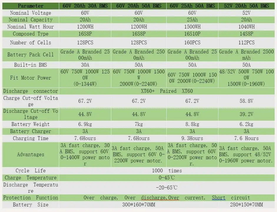 Преимущества | 3а быстрая зарядка, 50A BMS, поддержка больших мощных двигателей (0-1800 Вт) | 3A быстрая зарядка, 30A BMS, поддержка 48/52V 0-1000W | 3A быстрая зарядка, 40A BMS, поддержка 48/52V 0-1500W | Быстрая зарядка 4A, 50A BMS, поддержка 72V 0-2800W силового двигателя. | ||