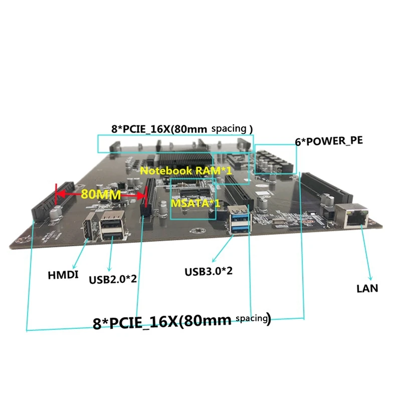 ETH80-B75 материнская плата IDC для компьютерной комнаты использует комбинацию чипов B75 и ЦП lga1155-контактный; 8 интерфейсов видеокарты разработаны с интервалом между слотами для карт 80 мм, что может поддерживать Майнинг больших видеокарт, И материнская плата совместима со стандартным корпусом 4U для компьютерной комнаты IDC. Материнская плата подходит для горнодобывающей промышленности с ее богатыми расширительными интерфейсами и другими функциями.