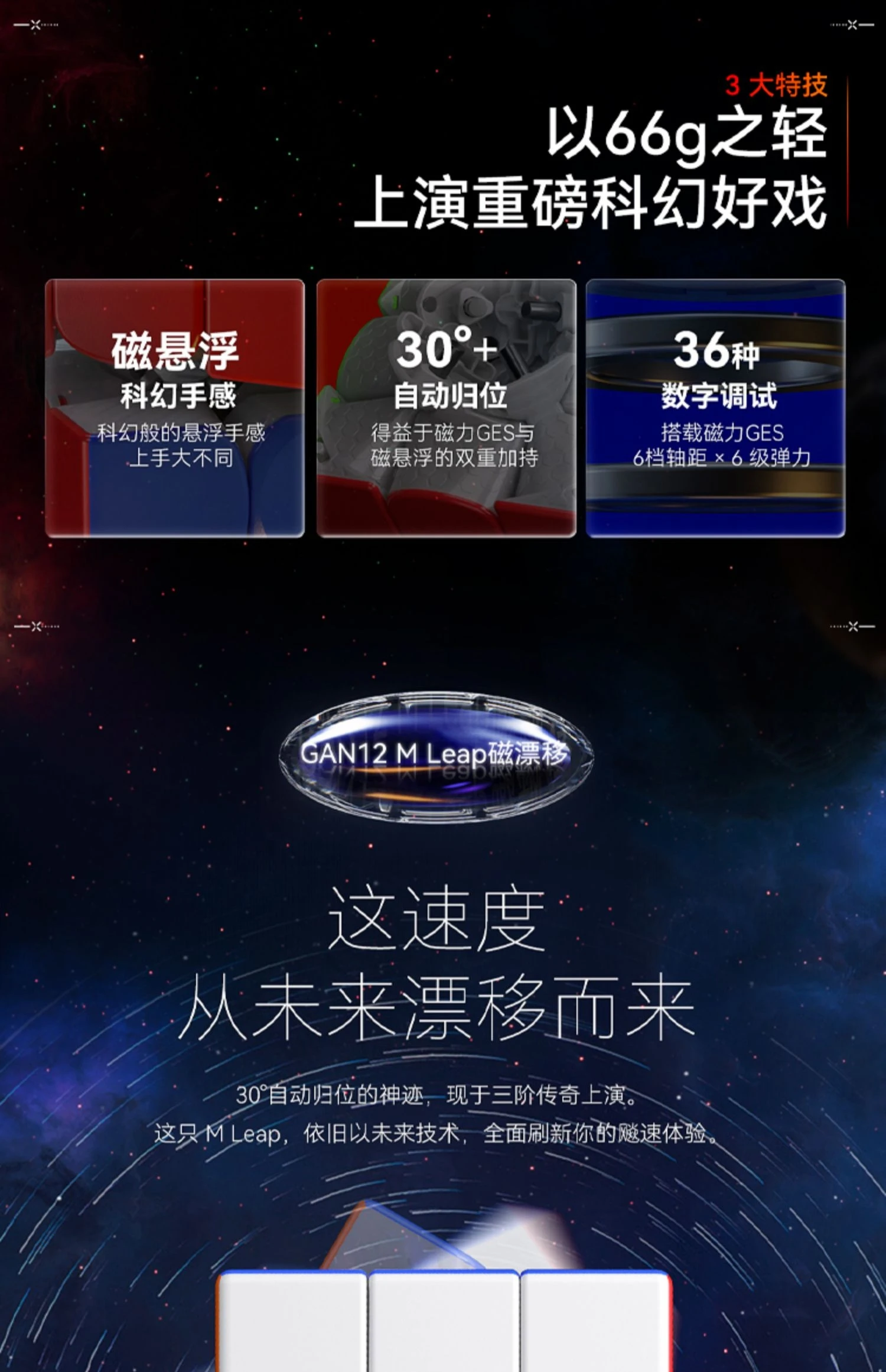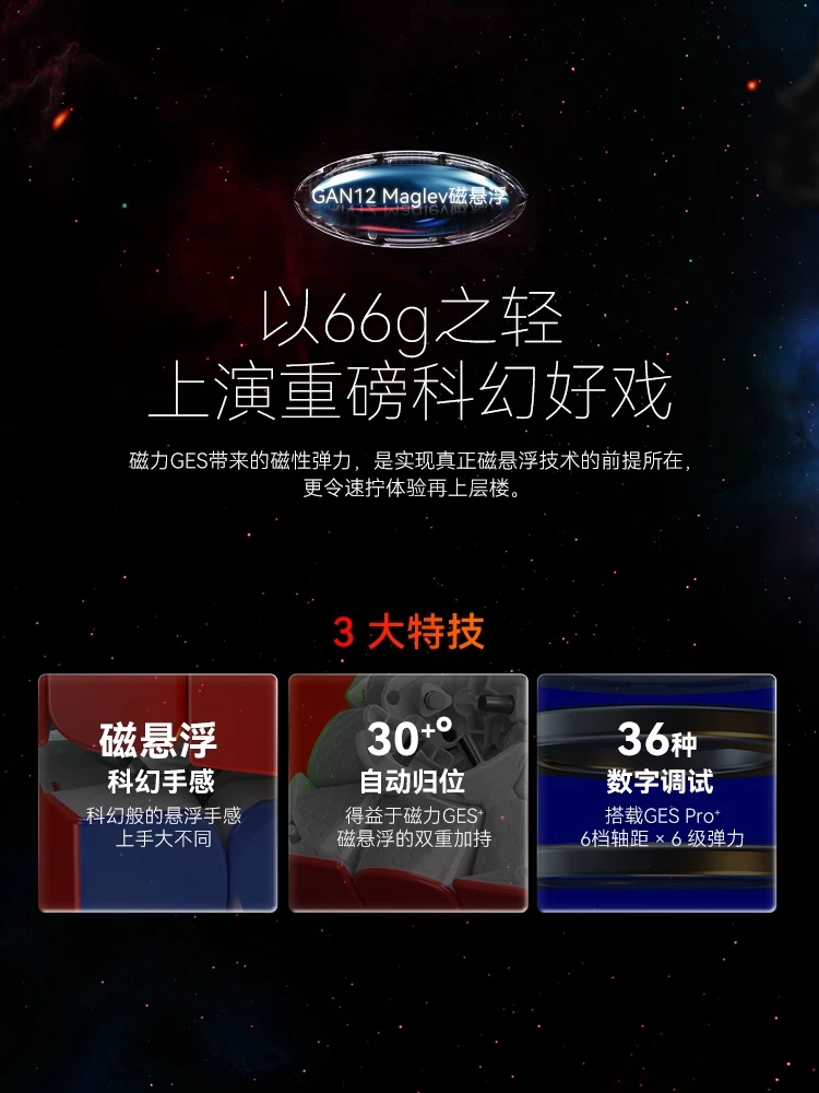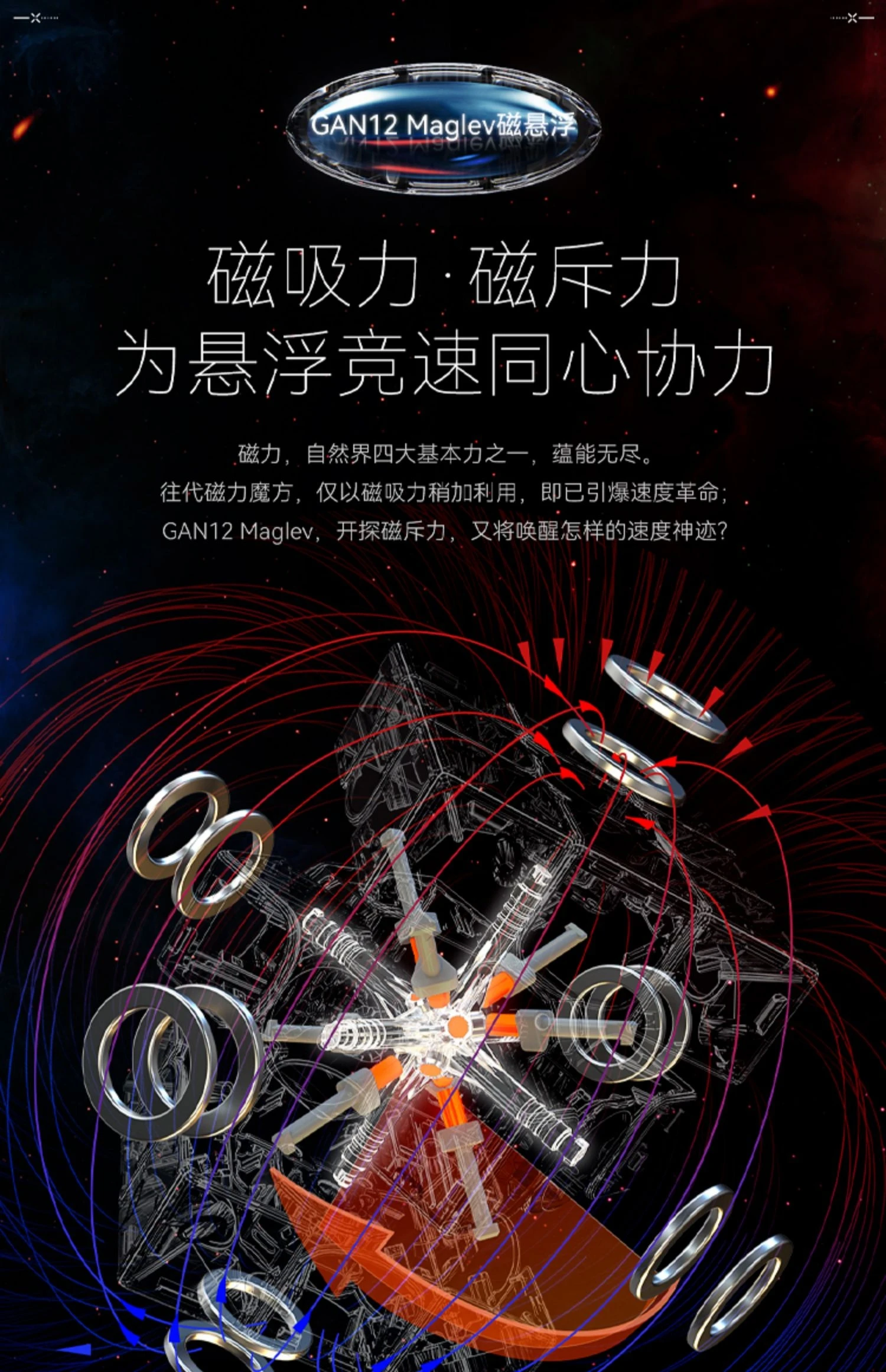 GAN12 MagLev UV 3x3 находится на самом пике 3x3 инноваций и дизайна. Этот флагманский пазл включает в себя регулируемые магниты на кусочках и регулируемую магнитную левитационную систему натяжения/сжатия. Эта технология использует противостоящие магниты, чтобы имитировать ощущение весны, а также уменьшая трение и пружинный шум. Эта версия имеет глянцевое покрытие внешней поверхности.
