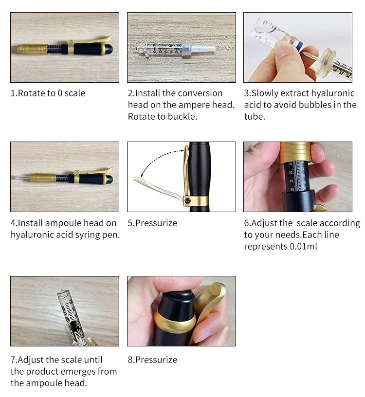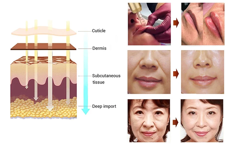 Используйте с косметическими продуктами, удаляйте морщины, удаляйте мешки для глаз и гусиные лапки, уплотняйте губы, отбеливайте, Увлажняйте, омолаживайте кожу, против морщин, против старения, тонкое лицо, укрепляющий подтяжку лица и т. Д. Вы можете вводить небольшое количество гиалуроновой кислоты, Витамин С или другие усилители кожи, а затем впрыснуть их в глубокую дерму, чтобы оставить кожу красивой.