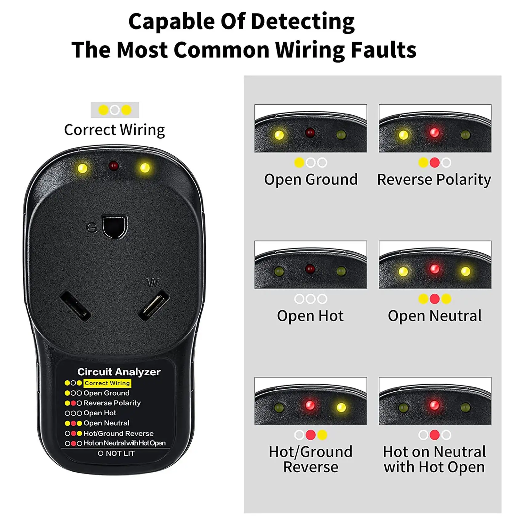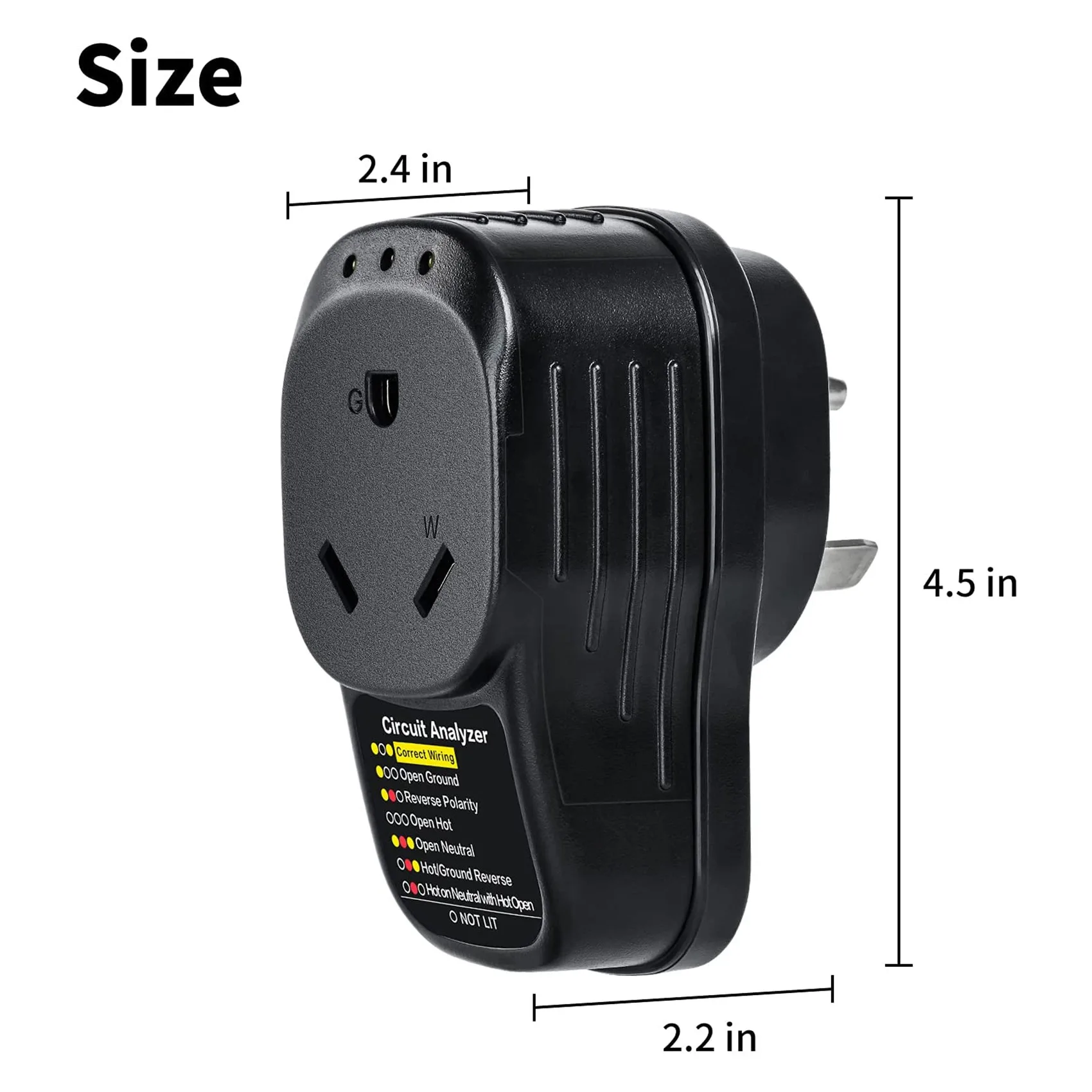 Светодиодный светильник индикатора: вставьте анализатор цепи в гнездо перед установкой линии кемпинга. Светодиодный индикатор горит, чтобы показать состояние питания, и когда индикатор показывает неправильное соединение, это напомнит вам, чтобы избежать постоянного повреждения вашего RV