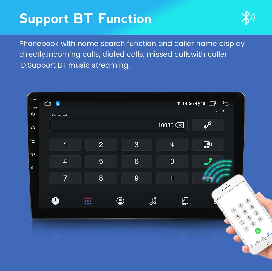 > Автомобильная стереосистема оснащена встроенным BT и функцией телефонной книги. Вы можете синхронизировать телефонную книгу с вашего мобильный телефон на этот блок, а затем сделать мобильный телефон без рук удобным и быстрым. Вы также можете наслаждаться беспроводным воспроизведением музыки с вашего устройства BT.