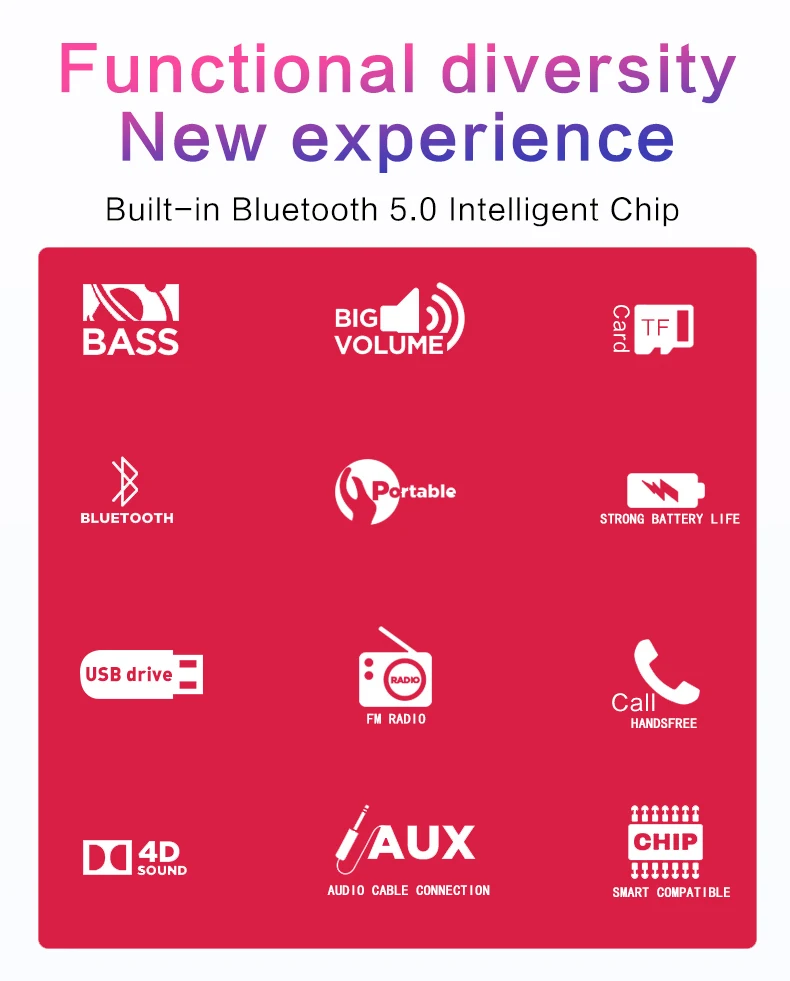 Поддержка воспроизведения AUX карты U disk, функция fm-радио, BT5.0 поддержка двухканального стерео s