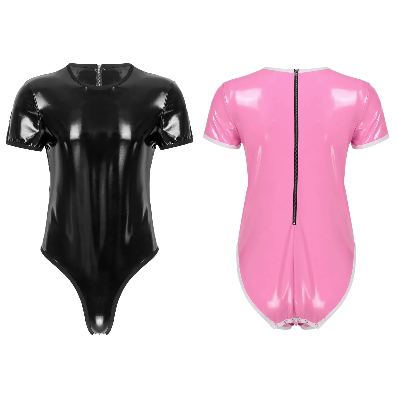 Мужской комбинезон из лакированной кожи с коротким рукавом и круглым вырезом на молнии; Трико; Клубная одежда.