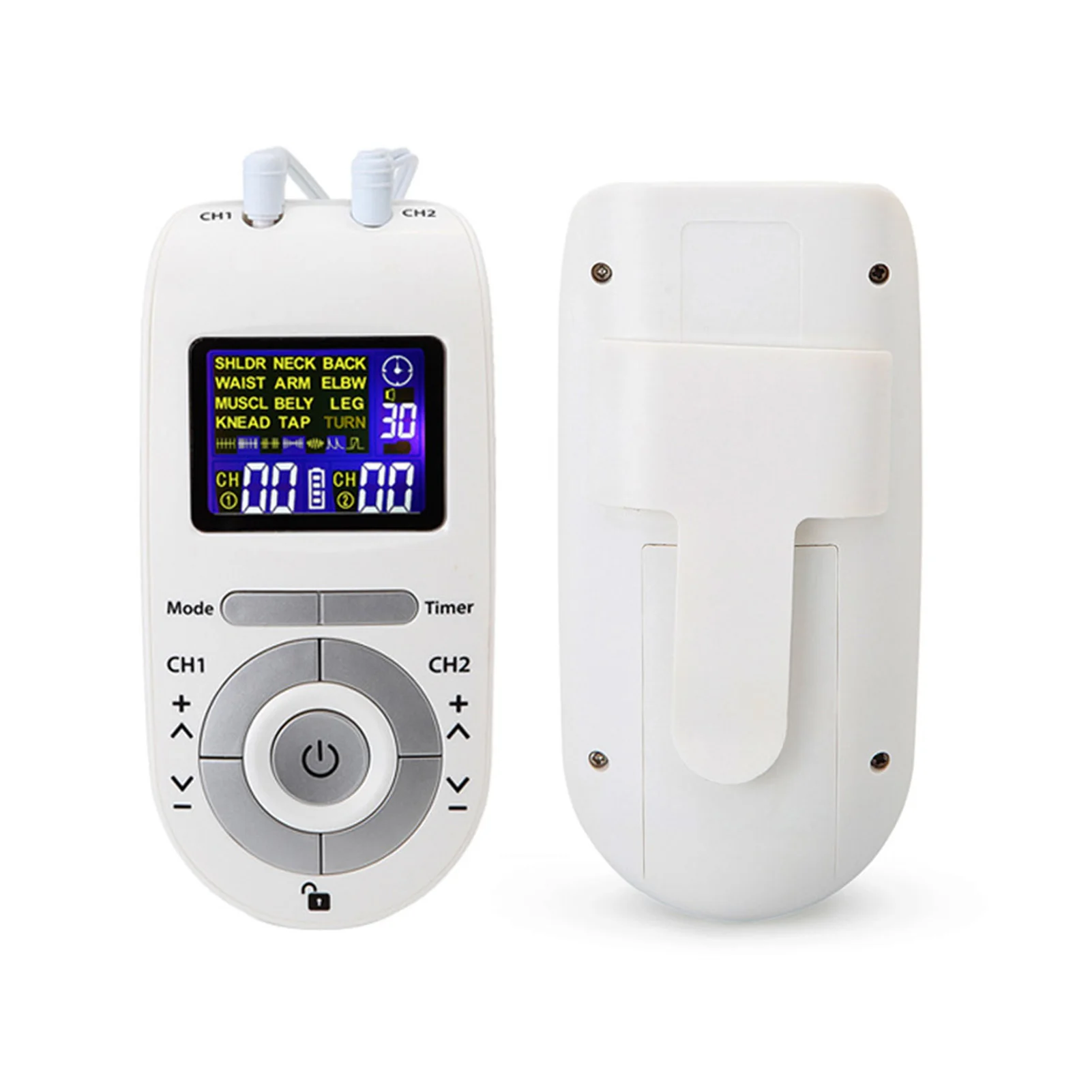 Это Двухканальное десятки и устройство ЭМС предлагает 12 режимов массажа с каждым 40 уровнями прочности. И он показывает текущий режим массажа, уровень прочности и заданное время 2 канала на ЖК-дисплее. Кроме того, он поддерживает время регулировки от 5 до 90 минут.